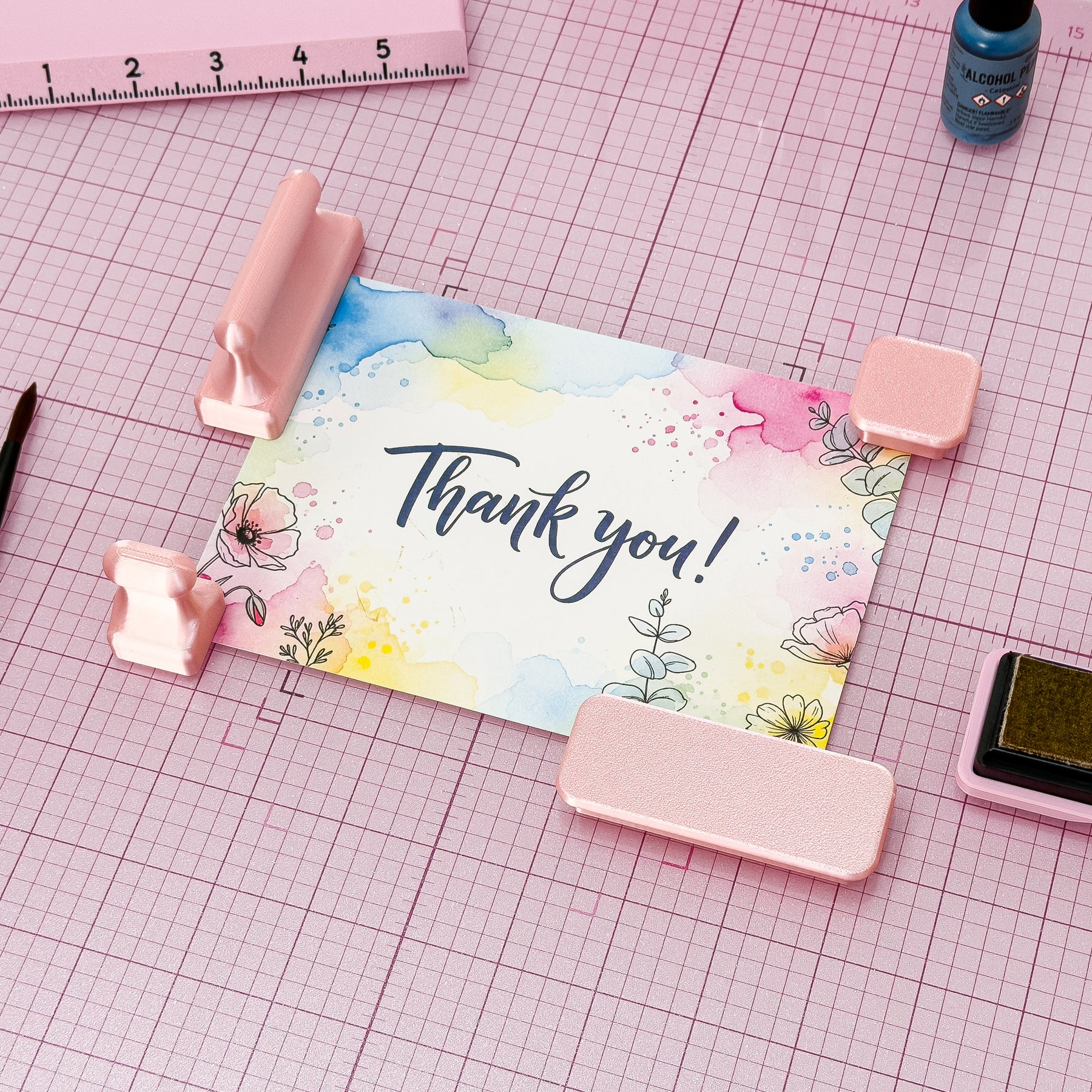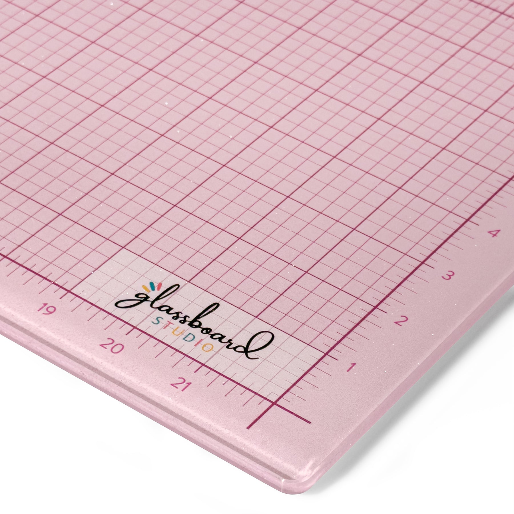Glass surfaces are ideal for crafting and mixed media art. They’re quick to clean, heat resistant, and stain-proof, making them perfect for mixing various mediums directly on the board. The heat resistance supports techniques like heat embossing, while the metal backing creates a magnetic surface for securely holding paper, stencils, fabric, and more with rare earth magnets. The integrated grid includes 1-inch and 1/4-inch increments, 1/8-inch tick marks along the border and centerlines, and corner guides for classic card sizes.